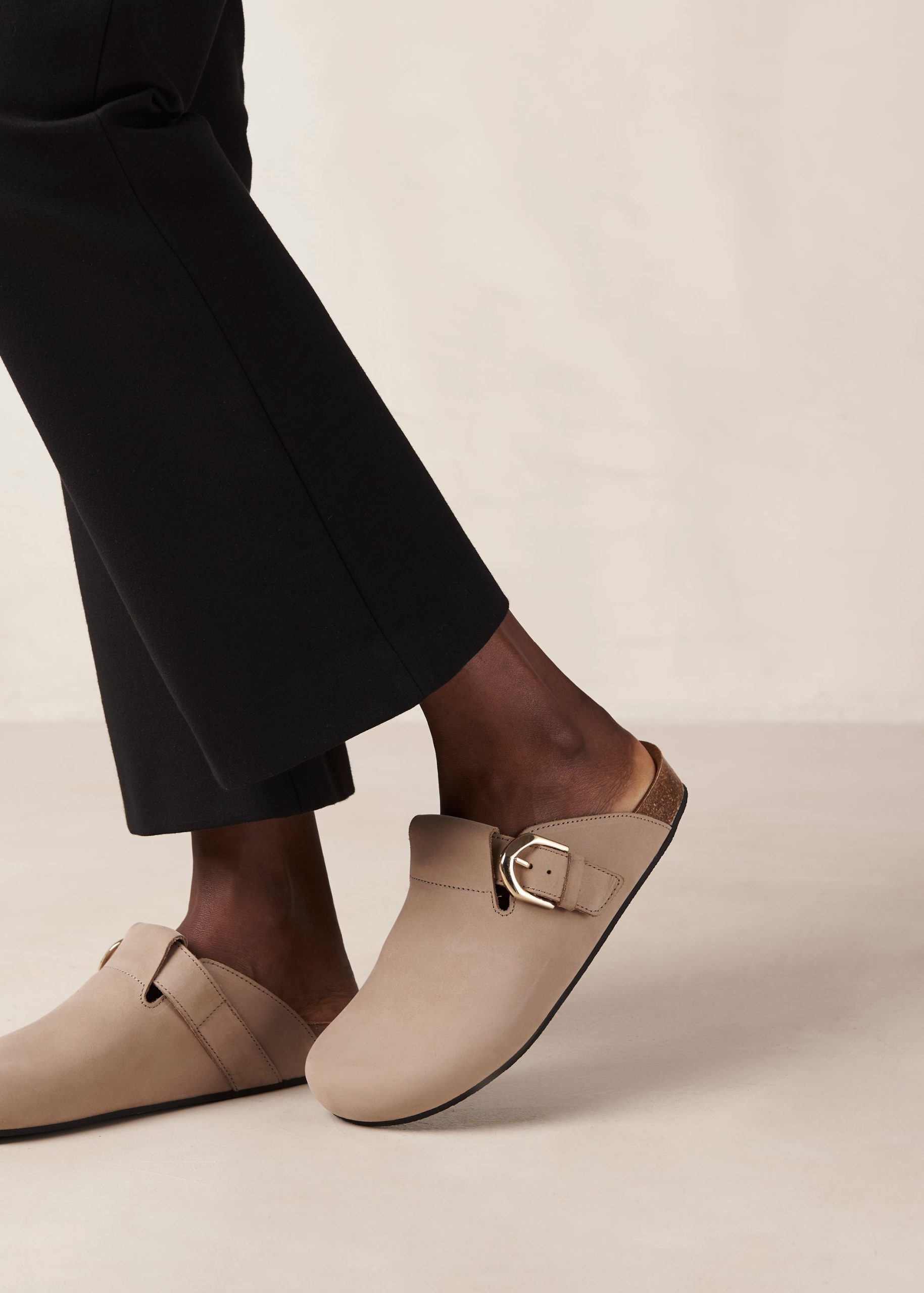 Featuring contoured footbeds and soft insoles. the Travis mule is so comfortable you could wear it as a slipper as well. It’s shaped from grey nubuck leather to a closed-toed clog with chunky buckled straps and no back.