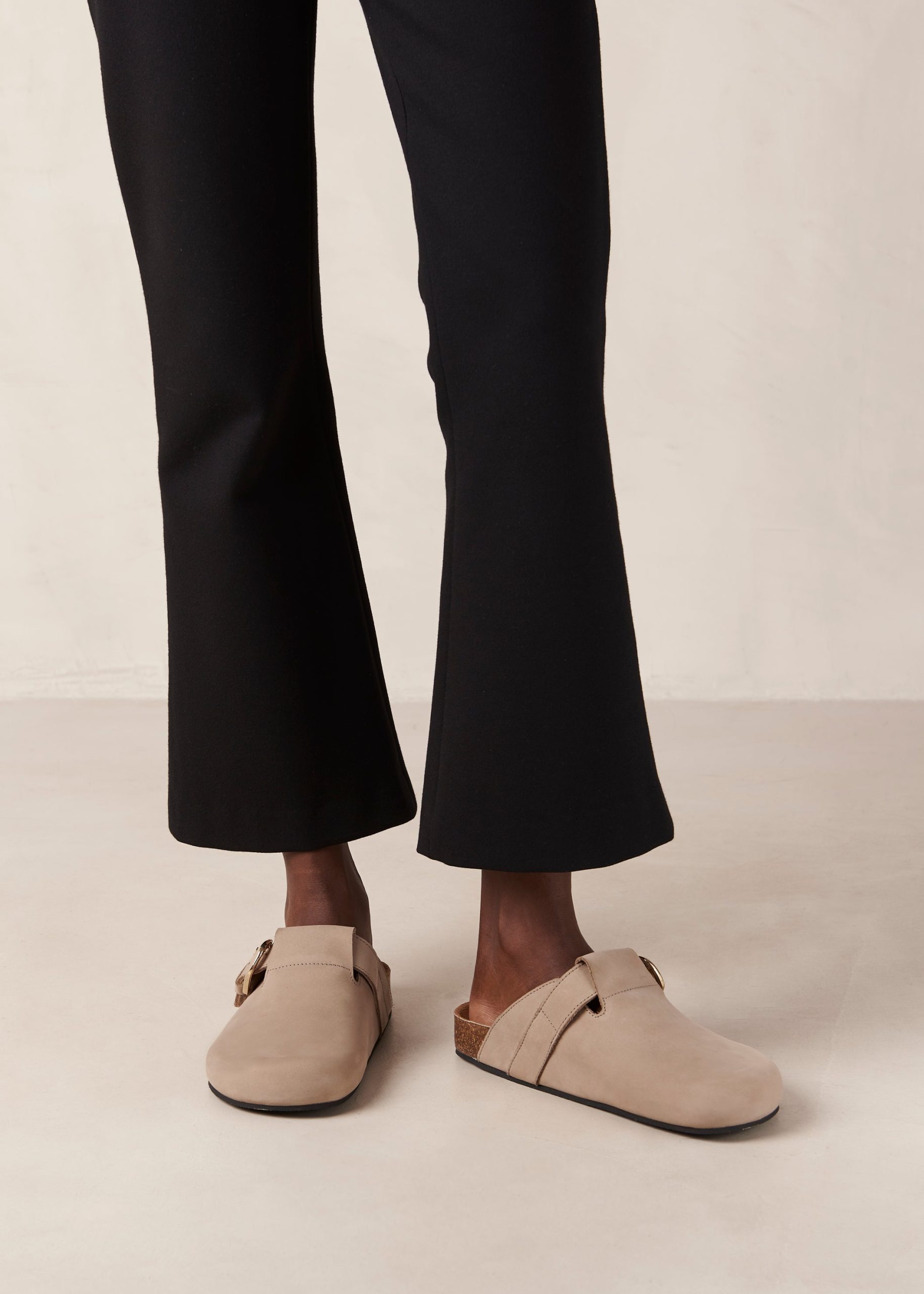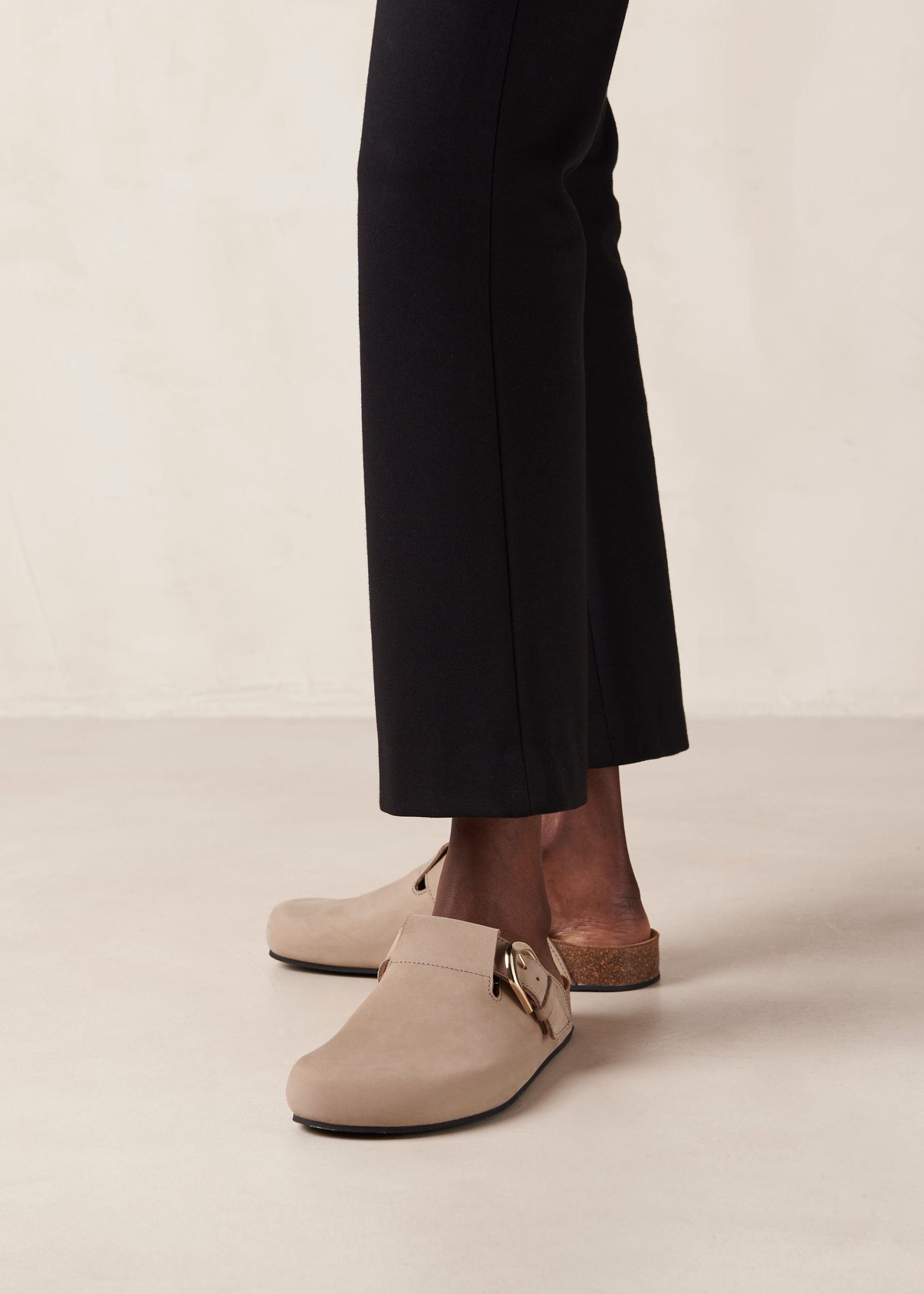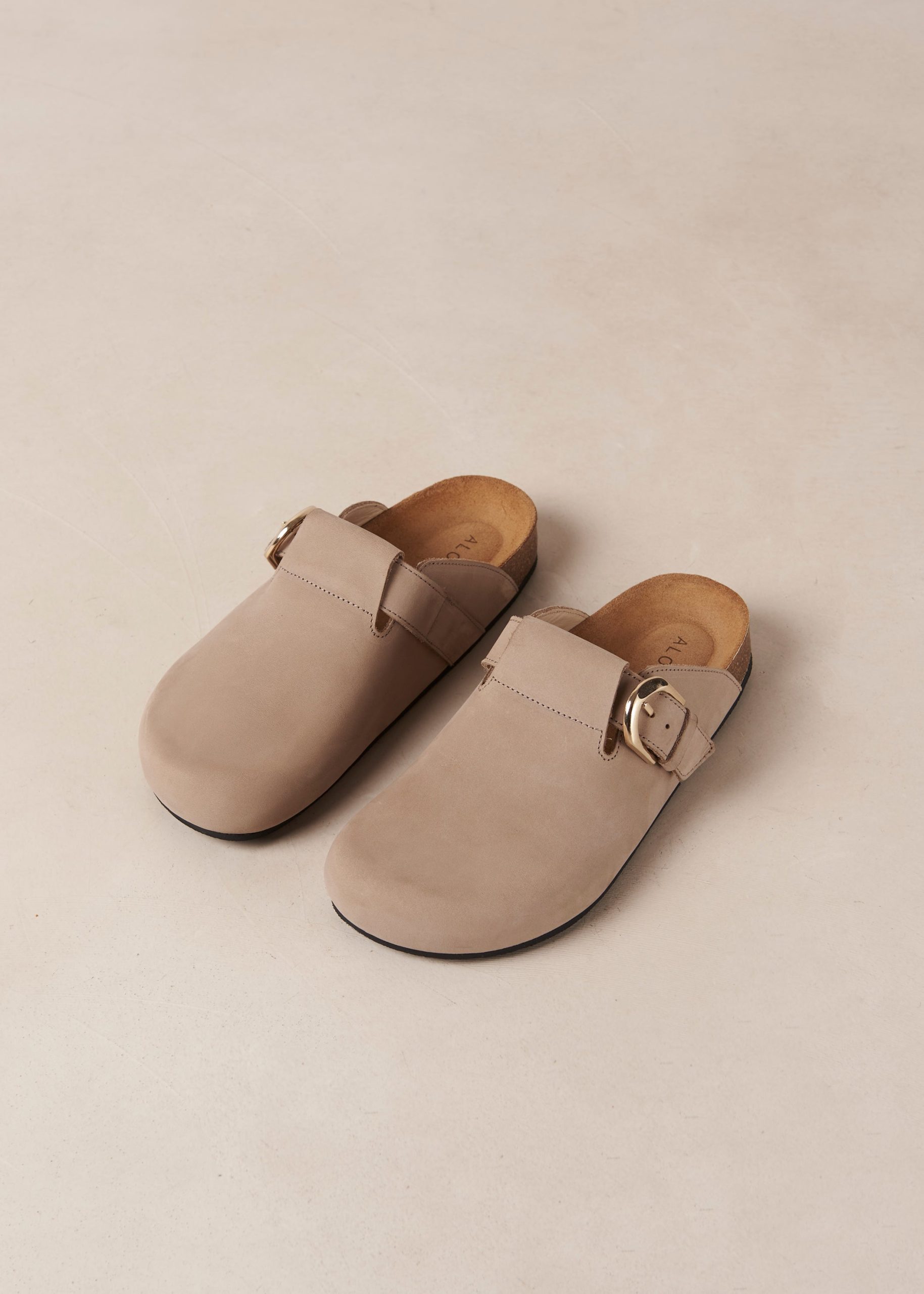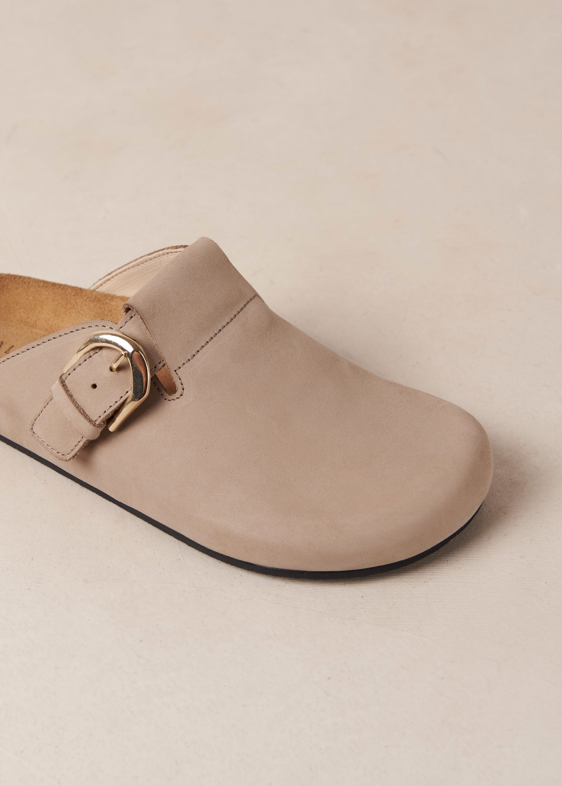 Featuring contoured footbeds and soft insoles. the Travis mule is so comfortable you could wear it as a slipper as well. It’s shaped from grey nubuck leather to a closed-toed clog with chunky buckled straps and no back.